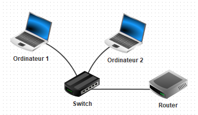 C'est la configuration de base d'un réseau local. Pour les réseaux locaux de type habitation, le switch et le routeur se trouvent rassemblés dans la box ADSL.
