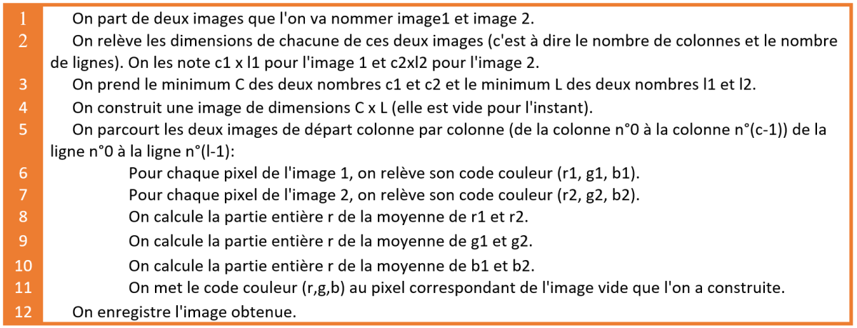 Pour la suite, il faut calculer chaque pixel de la nouvelle image à partir des pixels des images sources. Autrement dit, nous allons prendre les valeurs Rouges1, Vert1, et Bleu1 de chaque pixel de l'image 1, les valeurs Rouges2, Vert2, et Bleu2 de chaque pixel de l'image 2, puis calculer la valeurs moyenne des Rouges1 et Rouges2, Vert1 et Vert2, Bleu1 et Bleu2, et prendre ces valeurs pour définir les pixels de la nouvelle image qui seront intégrés dans l'image vide.